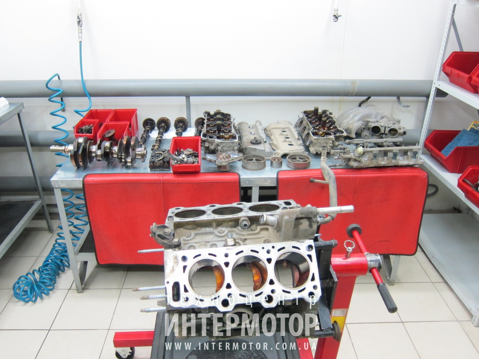 Цех по ремонту оснащен всем необходимым инструментом, позволяющим выполнить демонтаж, разборку, сборку и установку мотора. При этом немалое внимание уделено специальному инструменту – различным приспособлениям, съемникам и оправкам, без которых выполнить многие операции сложно или даже невозможно. То же самое относится и к технической информации – без книг и компакт-дисков фирм Autodata, Alldata и Mitchell, каталогов производителей автомобилей и запчастей, моторный ремонт для многих автомобилей не может быть качественным.